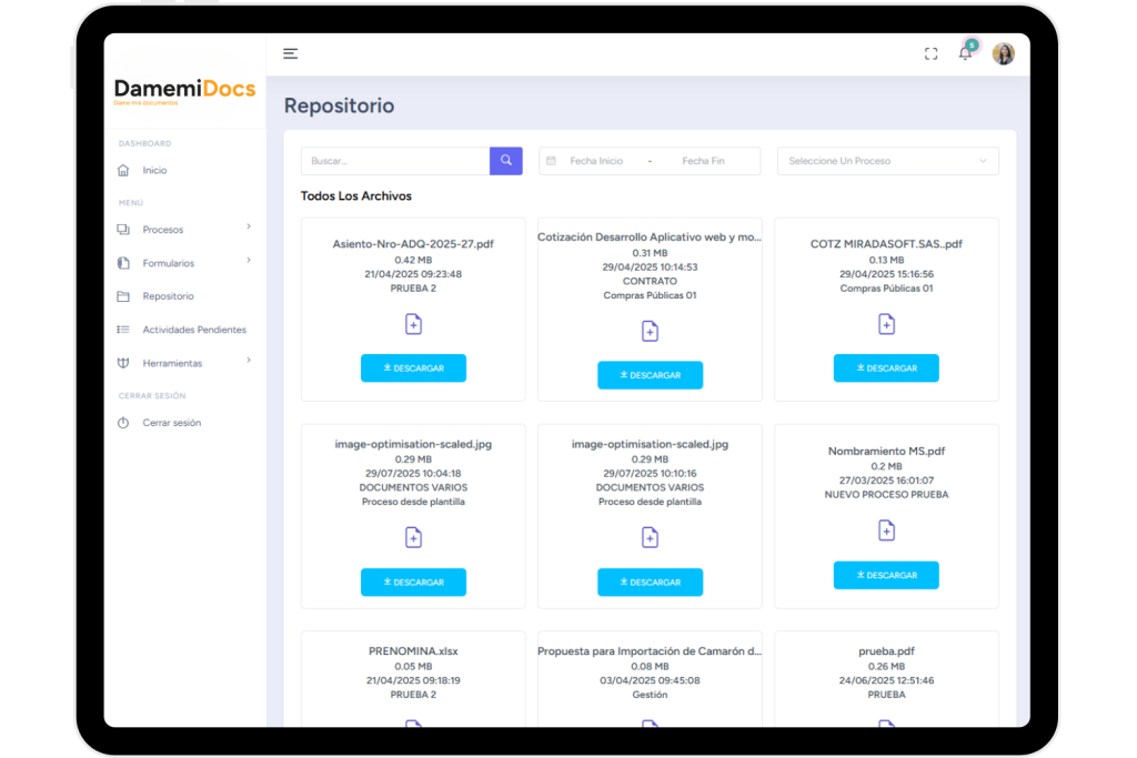 Busca archivos o procesos en segundos usando palabras clave, etiquetas o fechas, y filtra por estado para tener control total del flujo de trabajo.
