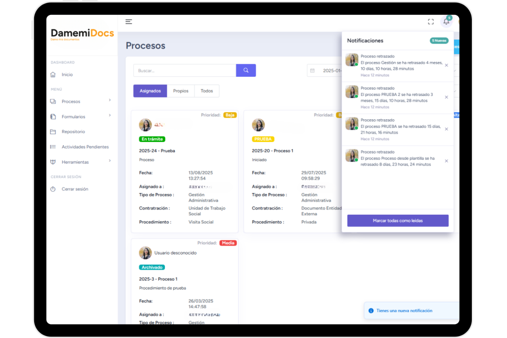 Recibe avisos automáticos sobre acciones pendientes, documentos urgentes o retrasos, para mantener los procesos en movimiento.